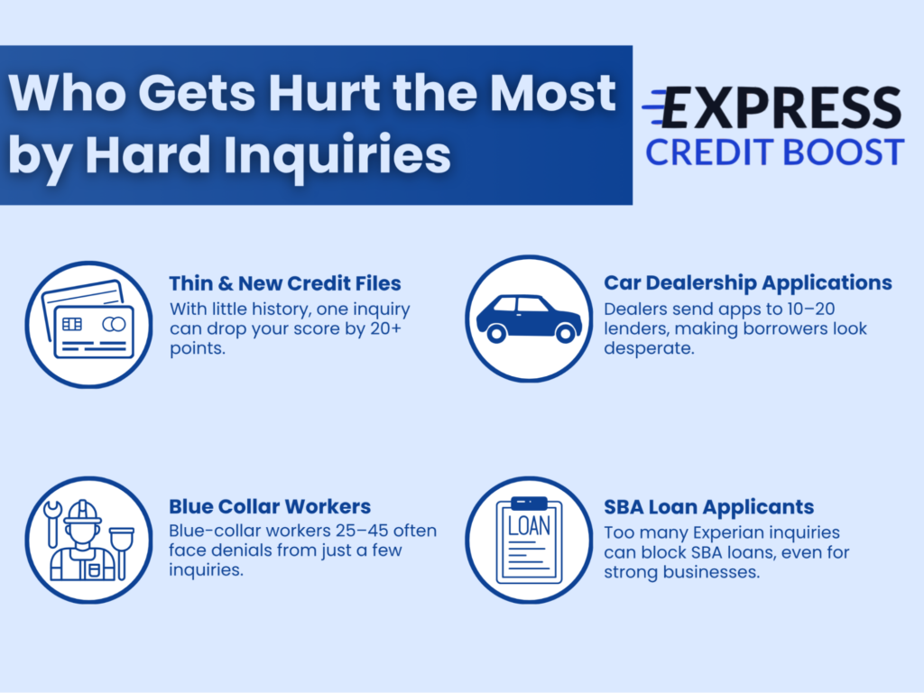 Those with new credit files, SBA loan applicants, and auto buyers are often the most vulnerable, since inquiries hit their scores harder and can create the impression of financial desperation.